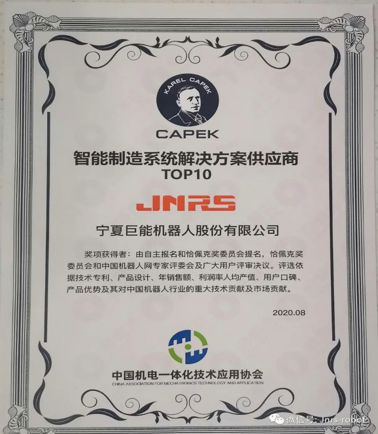 在本屆“恰佩克獎”頒獎盛典上,巨能機器人榮獲“智能制造系統(tǒng)解決方案供應商TOP10”獎項。獎項的獲得,再次證明了巨能機器人在智能制造系統(tǒng)解決方案的相關技術實力。