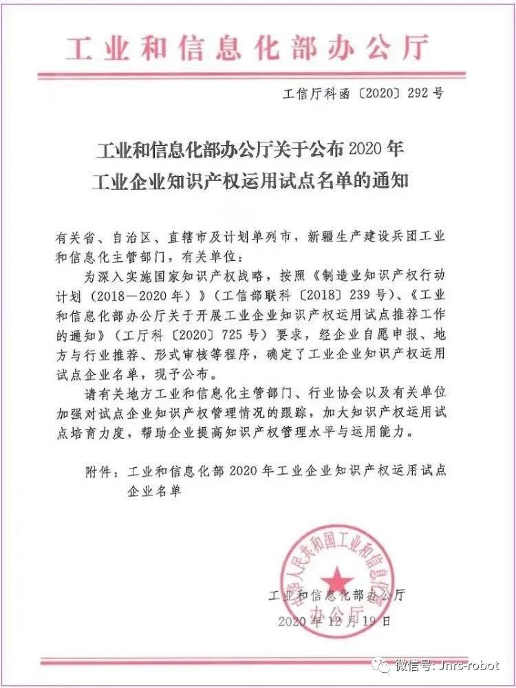 近日,工業(yè)和信息化部公布了2020年度工業(yè)企業(yè)知識(shí)產(chǎn)權(quán)運(yùn)用試點(diǎn)名單,寧夏巨能機(jī)器人股份有限公司入選。
