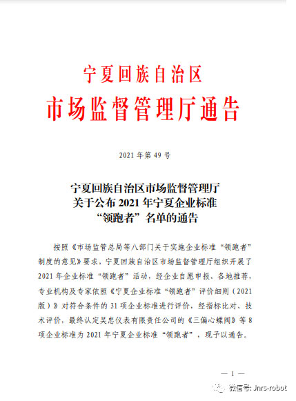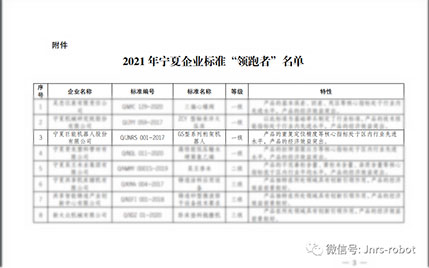 巨能機(jī)器人公司《GS系列桁架機(jī)器人》企業(yè)標(biāo)準(zhǔn)入選2021年寧夏企業(yè)標(biāo)準(zhǔn)“領(lǐng)跑者”名單。