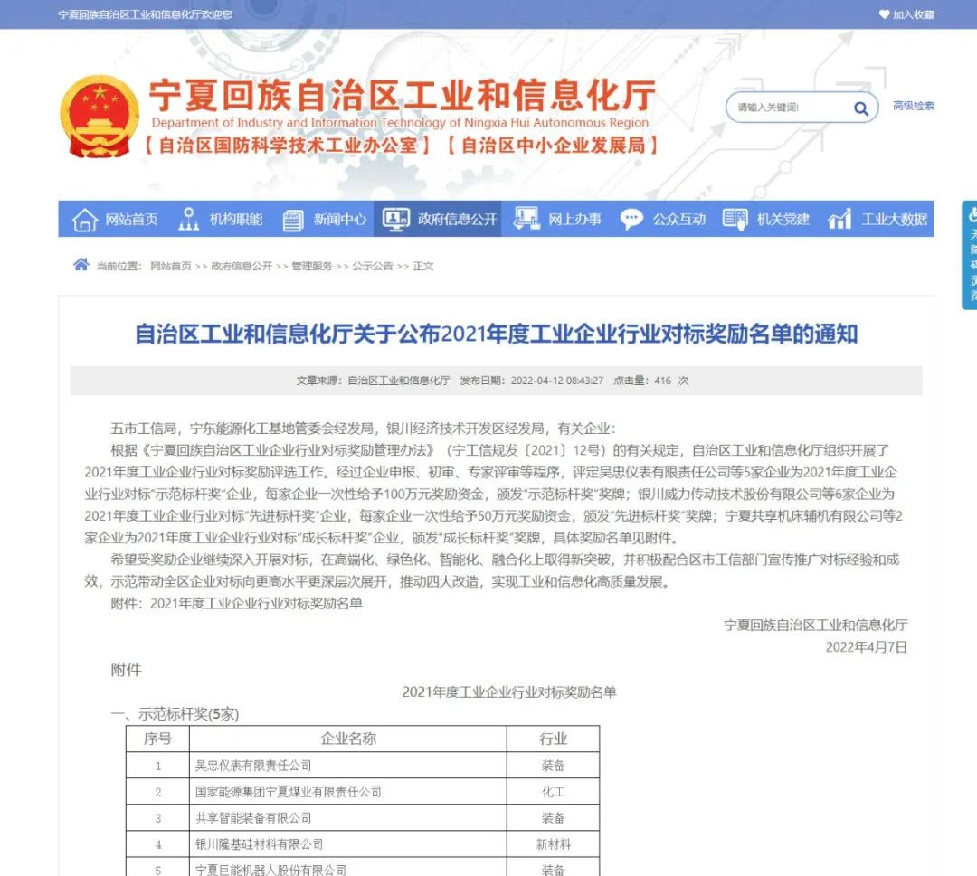 近日,自治區(qū)工業(yè)和信息化廳公布了2021年度工業(yè)企業(yè)行業(yè)對標(biāo)獎勵名單。根據(jù)《寧夏回族自治區(qū)工業(yè)企業(yè)行業(yè)對標(biāo)獎勵管理辦法》(寧工信規(guī)發(fā)〔2021〕12號)的有關(guān)規(guī)定,自治區(qū)工業(yè)和信息化廳組織開展了2021年度工業(yè)企業(yè)行業(yè)對標(biāo)獎勵評選工作。經(jīng)過企業(yè)申報、初審、專家評審等程序,巨能機(jī)器人等5家企業(yè)為2021年度工業(yè)企業(yè)行業(yè)對標(biāo)“示范標(biāo)桿獎”企業(yè)并授予獎牌。