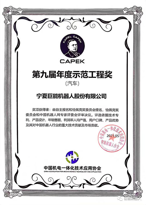“恰佩克”,素有“機(jī)器人行業(yè)諾貝爾”之稱,該獎(jiǎng)項(xiàng)的設(shè)立,旨在對(duì)機(jī)器人行業(yè)中具有戰(zhàn)略遠(yuǎn)見(jiàn)的領(lǐng)導(dǎo)型企業(yè)做標(biāo)桿定位。在5月18日落幕的第十三屆中國(guó)國(guó)際機(jī)器人高峰論壇暨第九屆恰佩克頒獎(jiǎng)儀式現(xiàn)場(chǎng),巨能機(jī)器人憑借在工業(yè)機(jī)器人智能制造系統(tǒng)解決方案的綜合實(shí)力和市場(chǎng)口碑,榮膺“第九屆恰佩克獎(jiǎng)年度示范工程獎(jiǎng)”。
