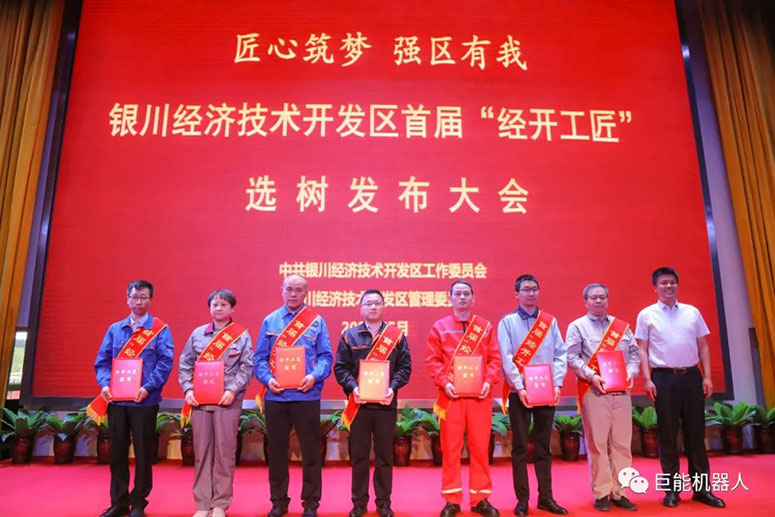 5月30日上午,銀川經開區(qū)數字經濟產業(yè)園報告廳內掌聲雷動、“匠”星閃耀,首屆“經開工匠”選樹發(fā)布大會在這里隆重召開,園區(qū)來自不同行業(yè)20名產業(yè)工人被選樹為“經開工匠”。巨能公司機械設計部部長董德被評為“經開工匠”稱號。
